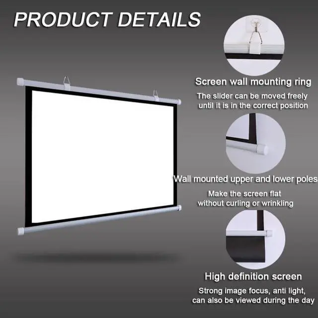 This durable manual projection screen can be wall or ceiling mounted and roll up when needed. Watch your favorite movies on the big screen, play video games with friends, or share work-related presentations or videos with a large group of people.