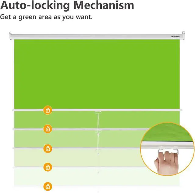 Auto-Locking Mechanism: when you roll down this green backdrop, you can adjust the height by just releasing the screen to the position you want, then it can be auto-locked, you get a green area as you want.