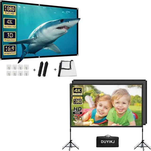 Projector Movie Screen Fabric 100% Crafted from natural polyester fabric, our 84 inch projection screen offers sharper and brighter visuals compared to many others on the market. Thicker and smoother, it supports 3D and HD movies with high color reflection. Available in a 16:9 format, projector screen it's for both living rooms and backyards. Each package includes 1 projector screen, 2 cords, and hooks for easy setup.