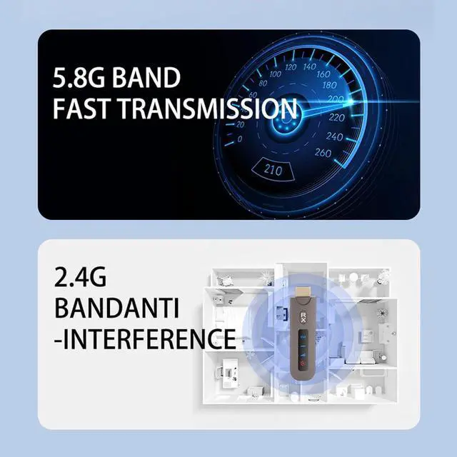 DUAL BAND: Plug and play wireless HD transmitter receiver supports dual band transmit of 2.4G and 5.8G. The picture is stable and fluent, and the transmit distance is 50 meters