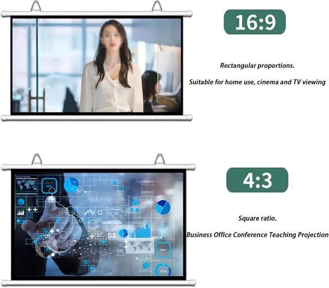 Projection screen: Super 178-degree viewing angle ensures clear visual effects no matter where the viewer is. Two ratios, choose according to use: 16:9 rectangular ratio is suitable for home use, and 4:3 square ratio is suitable for office use