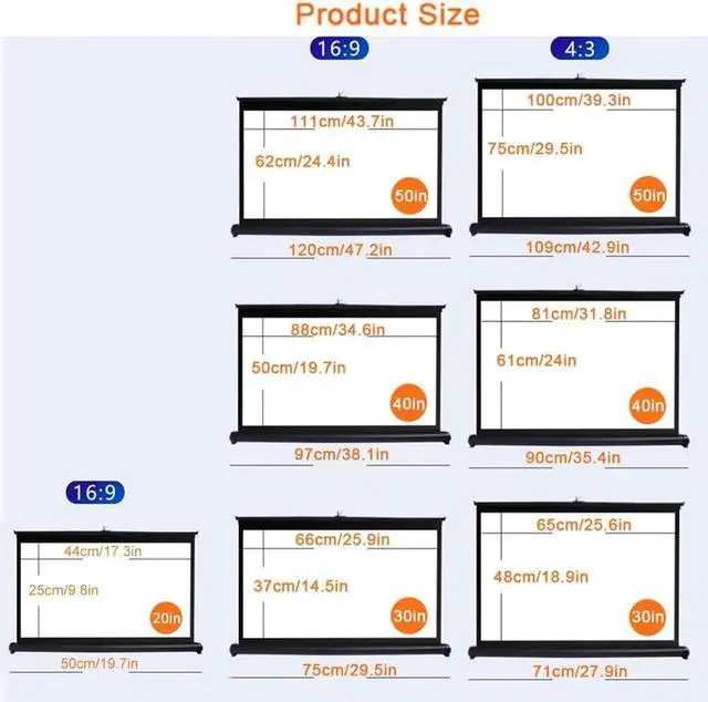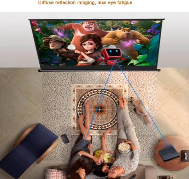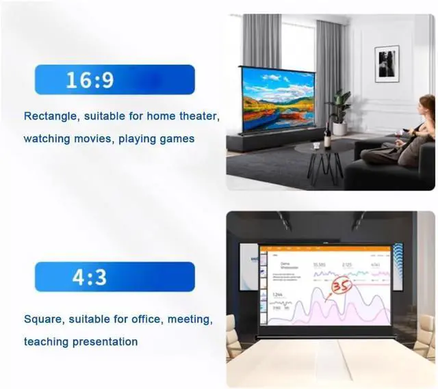 Projection screen ratios are 16:9 and 4:3; 4:3 for office, teaching and training, 16:9 for home theater, playing games and more.