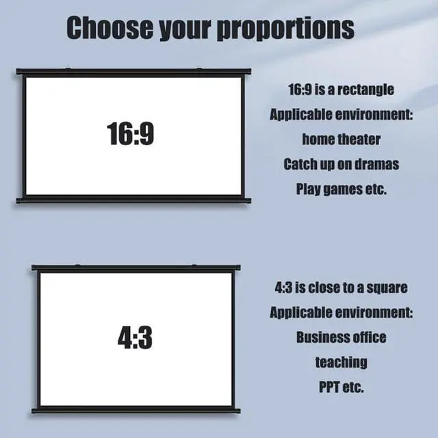 Screen format. Projection resolution 800X600 or 1024X768 It is recommended to buy 4:3; Projection resolution: 800X480, 1280X720 1920X1080 It is recommended to buy 16:9.