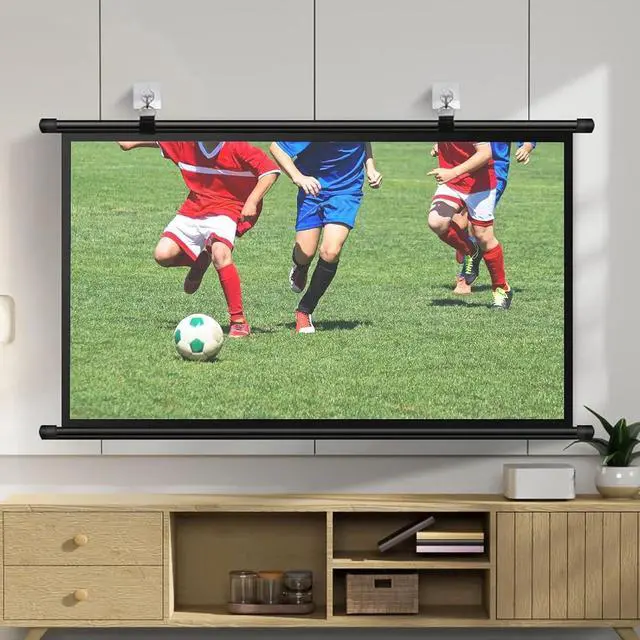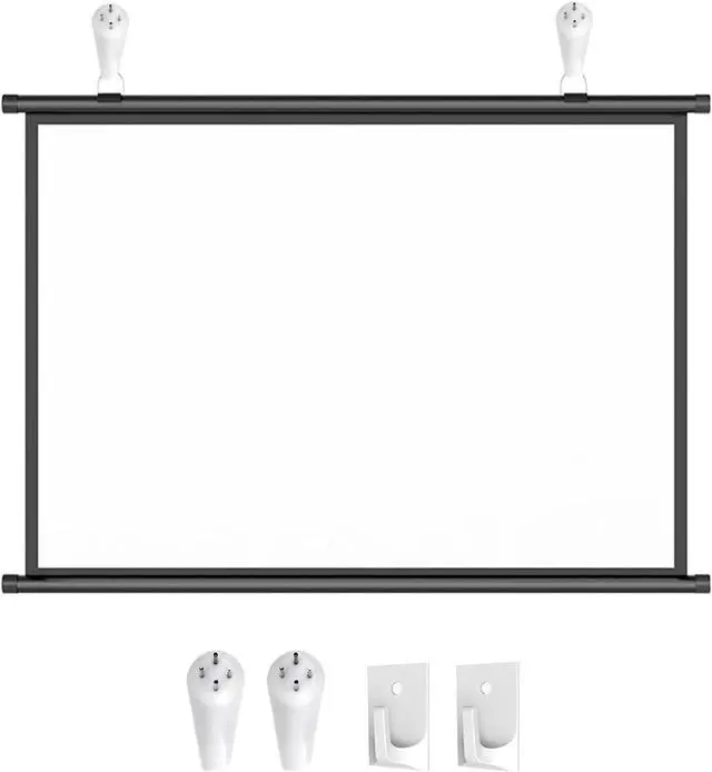 Wall-Mounted Projection Screen: The drop-down projection screen features hanging rings that move left or right, so you can easily mount the screen on a wall or ceiling for office presentations, outdoor backyard movies, or home theater.