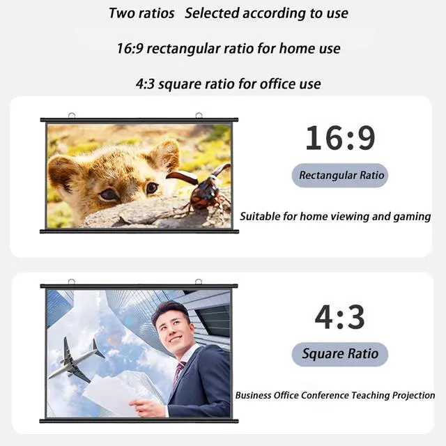 Made of fiberglass: The home theater projection screen is made of white fiberglass, the projector screen is not easy to wrinkle after folding. It won't turn yellow even after long-term use, is durable and stain-proof. There are two film screen ratios to choose from, 16:9 and 4:3.