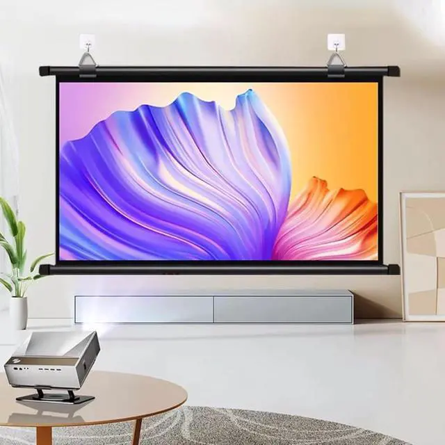 The wall-mounted projection screen can be moved from side to side via hanging rings for unrestricted perforated space, making it ideal for home theaters, conference rooms, classrooms and outdoor movie nights.