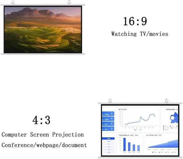 4:3 and 16:9 projector screens: the 16:9 screen is narrower and more suitable for home theaters, watching movies, and TV programs. The 4:3 screen is more suitable for office teacher training, business presentations, and practical use.