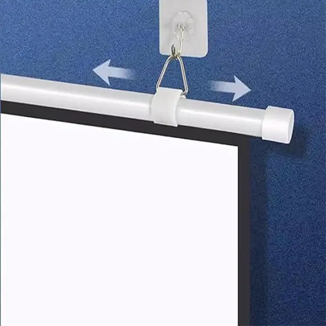 The portable projector screen has top hooks that can be adjusted left or right to accommodate different hanging distances. It supports multiple installation methods such as ropes, adhesive hooks, and nails (not included), allowing for quick installation on walls or ceilings.