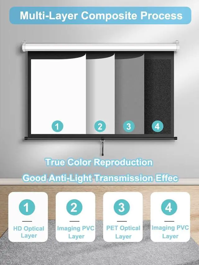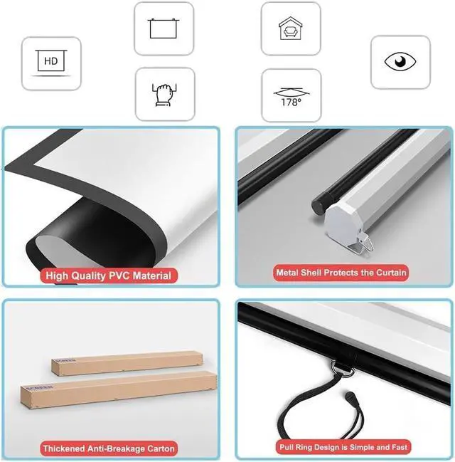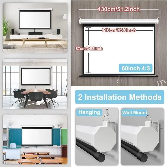 Manual pull-down projector screen requires no electricity and is lightweight and convenient. Can be easily rolled up to save space, perfect for indoor and outdoor use