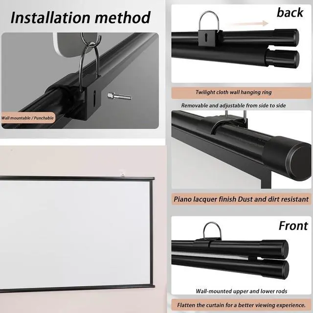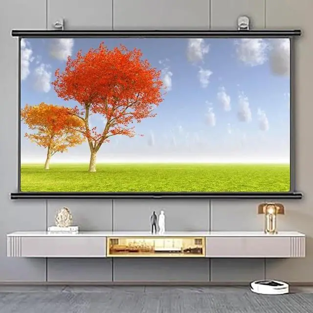 Wall-mounted installation: Manual pull-down projection screen can be easily installed on the wall or ceiling without drilling holes; quick to remove, 4:3, 16:9 picture format, supports 4K and full HD images, providing a perfect viewing experience
