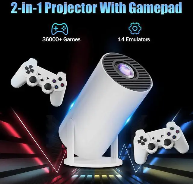HD OUTPUT& MULTI-DEVICE CONNECTIVITY:This outdoor projector delivers 1024*600P HD resolution, rendering intricate textures and true-to-life colors in any setting. It also supports an HD cable interface for direct connection to TV boxes, gaming consoles, and more,Experience the thrill of gaming on a big screen.This small projector can connect to various devices such as smartphones, laptops, and tablets.It also includes two wireless controllers, designed for ergonomic comfort and secure grip. These controllers deliver maximum precision, responding instantly to every button press and joystick movement