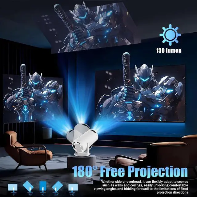 180° FLEXIBLE PROJECTION & AUTO KEYSTONE CORRECTION: This mini projector with wifi and bluetooth supports 180° flexible projection, breaking free from fixed-angle limitations. Paired with auto keystone correction technology, it eliminates the hassle of manual focusing and ensures no trapezoidal distortion from angle deviations.With 130 lumens of brightness, this phone projector delivers crisp, transparent images even during daytime with sheer curtains drawn, while maintaining true-to-life color reproduction. At night, its moderate brightness ensures comfortable viewing without eye strain