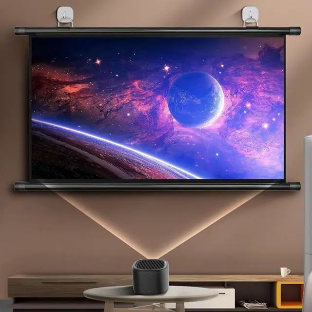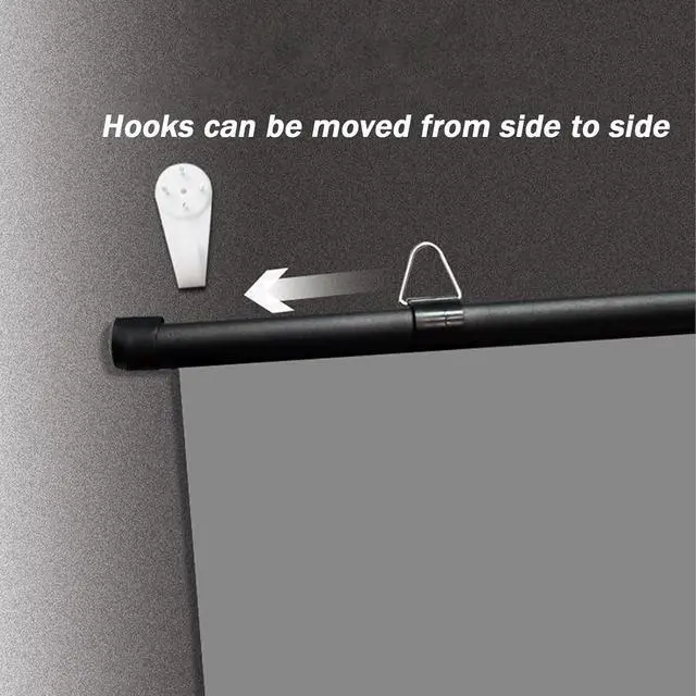 Portable: Manual rolling projection screen, lightweight, easy to transport and store, can be installed on the wall or ceiling, saving time and space. The wall-mounted projection screen can be moved from side to side via hanging rings for unrestricted perforated space,