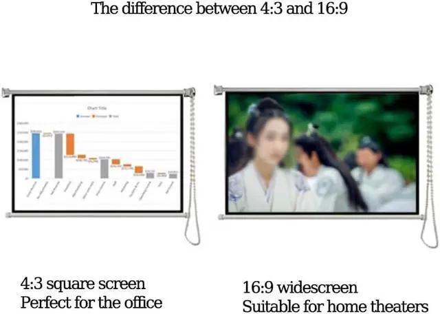 The 16:9 rectangular ratio is suitable for home movie viewing and gaming. The 4:3 nearly square ratio is suitable for business, office meetings, and educational projection.