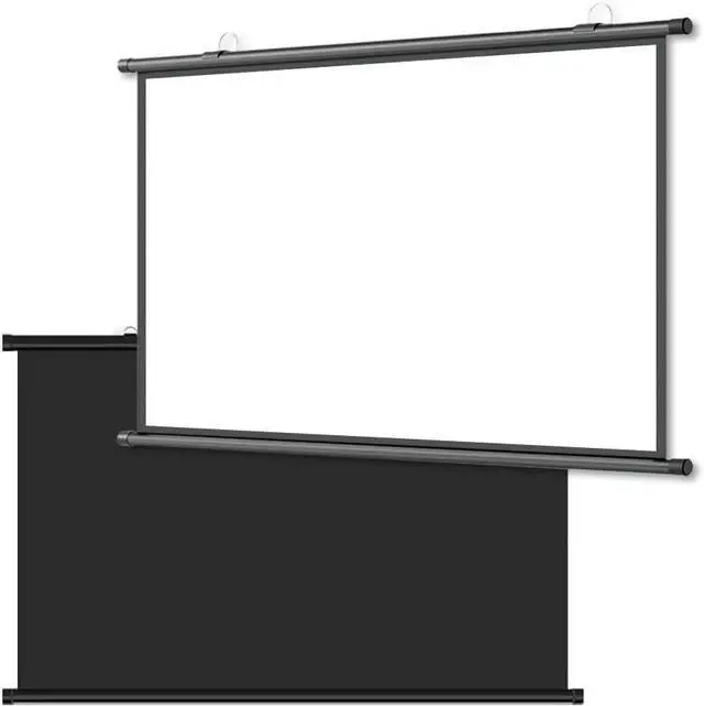 Manually pull-down projection screen, portable and foldable. The surface of the projection screen is made of white fiberglass, durable and resistant to fading or deformation. Even with long-term use, it will not curl or warp.