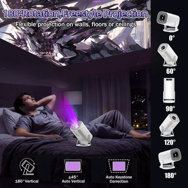 180° FLEXIBLE PROJECTION & THE PERFECT GIFT CHOICE: This mini projector with wifi and bluetooth supports 180° flexible projection, breaking free from fixed-angle limitations. Whether seated, reclining, or gathered in a group, you'll always find a comfortable viewing angle. This tv projectors serves as a daily projector, delivering large-screen visuals for movies and work. Toggle to gaming mode for relaxationno extra devices needed to play games directly. One device covers dual scenarios, making it an excellent gift for friends and family