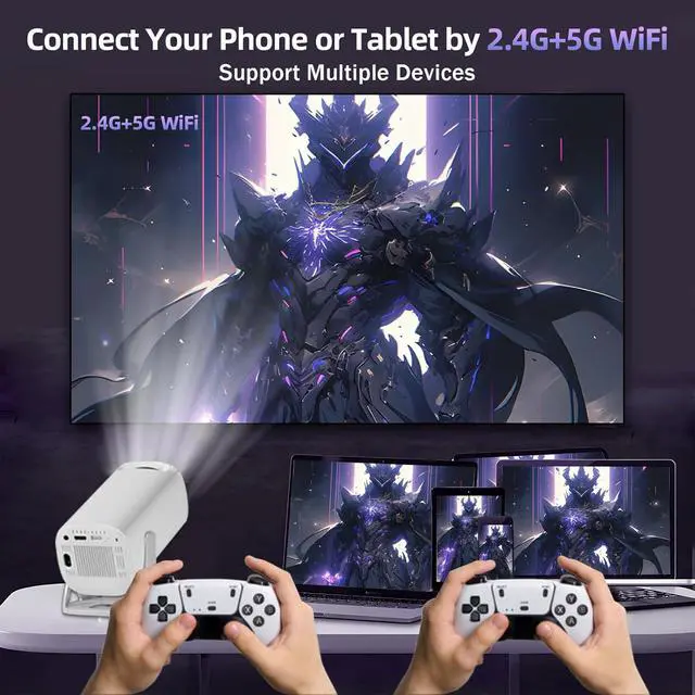 DUAL-BAND WIFI/BLUETOOTH & MULTI-DEVICE CONNECTIVITY: This phone projector features 2.4G+5G dual-band WiFi, ensuring smooth online game loading with zero lag or buffering, delivering synchronized visuals and audio. Bluetooth functionality adds flexibility to connectivity options. Connect this movie projector to smartphones, computers, and controllers for diverse entertainmentjust plug in to play videos. Enjoy games on a large screen for an immersive experience