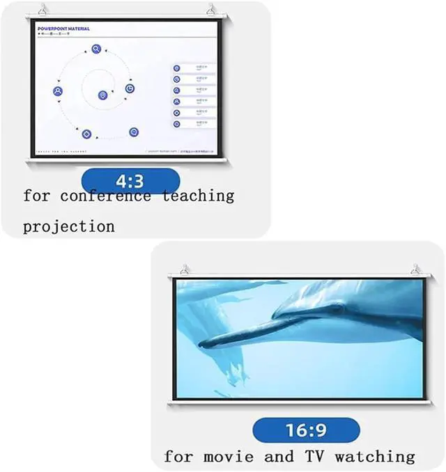 Projector screens come in 4:3 and 16:9 formats. The 4:3 screen is more square-shaped, suitable for office work, teaching, training, and business projections. The 16:9 screen is wider, ideal for home theaters, watching movies, and TV shows. Choose the screen ratio according to your needs.