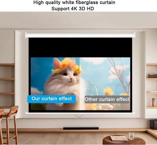 High quality projection screen: Made of high-quality matte white fiberglass material, compatible with all projectors on the market. Black border can enhance the color and contrast of the image.