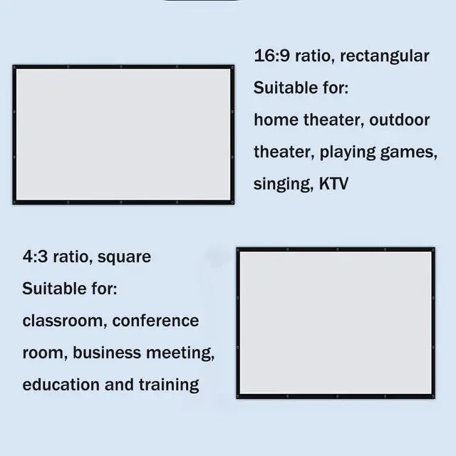 Size & Format 60-150 inches projection screen, 16:9/4:3 aspect ratio, projection screen supports 4K and Full HD pictures. Ultra-wide viewing angle projection, you can choose the most comfortable angle to enjoy movie night.