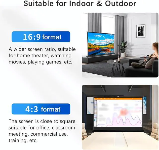 ?Portable projection screen can be placed anywhere indoors or outdoors, not only for home theatre and parties, but also for outdoor movies, backyard cinema and so on.