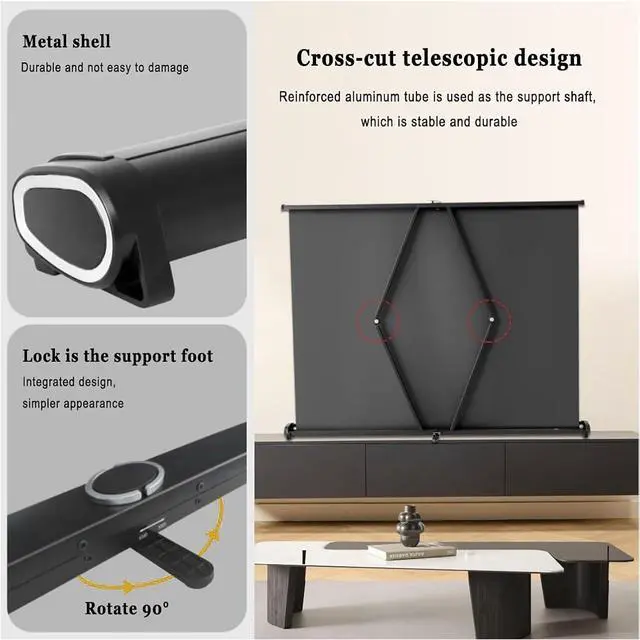 The desktop projection screen has a simple design, a retractable projection screen, and is easy to install. Just rotate the bottom bracket 90° and then pull the top metal ring to open it immediately for easy storage.