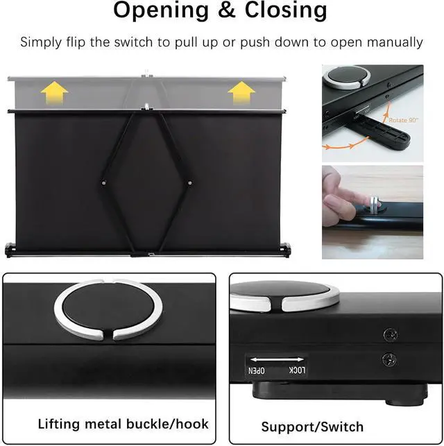 Stable and Durable: The portable projection screen is made of aluminium alloy housing, which is lightweight and durable. Simply rotate the switch angle by 90° and pull the screen out of the way to place it in the correct position.