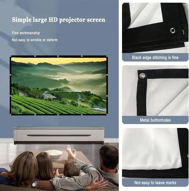 Wide field of view: Pull Down Non Crease Projection Screen, Ultra-wide-angle design, wide field of view, you can see the same clear picture quality anywhere in front of the screen, just adjust the most comfortable viewing position to enjoy a wonderful movie night