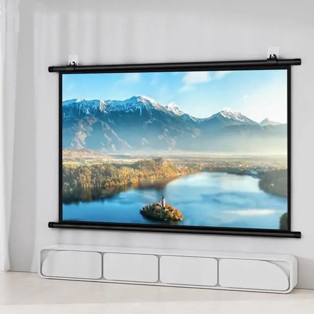 The manual pull-down projection screen is made of white fiberglass material, offering high color fidelity and long-lasting use without fading or deformation. The screen is thick and smooth, resistant to wrinkles, and durable.