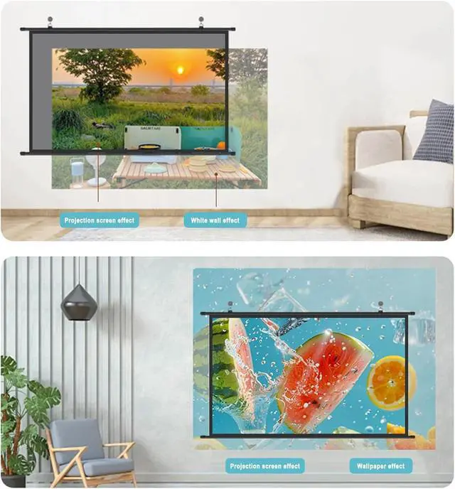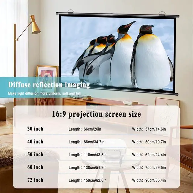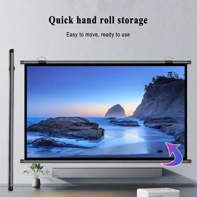 Thickened high-definition projection screen, outstanding surface texture, compact material, not easy to wrinkle, not easy to deform, can provide clear picture quality and bright colors for a long time, support 4K high-definition projection, black frame and backing can enhance its durability, wide viewing angle, the audience can get a clearer and more complete image when watching from different angles, manual roll storage, space saving, light weight, even one person can use it quickly, can also be carried when camping