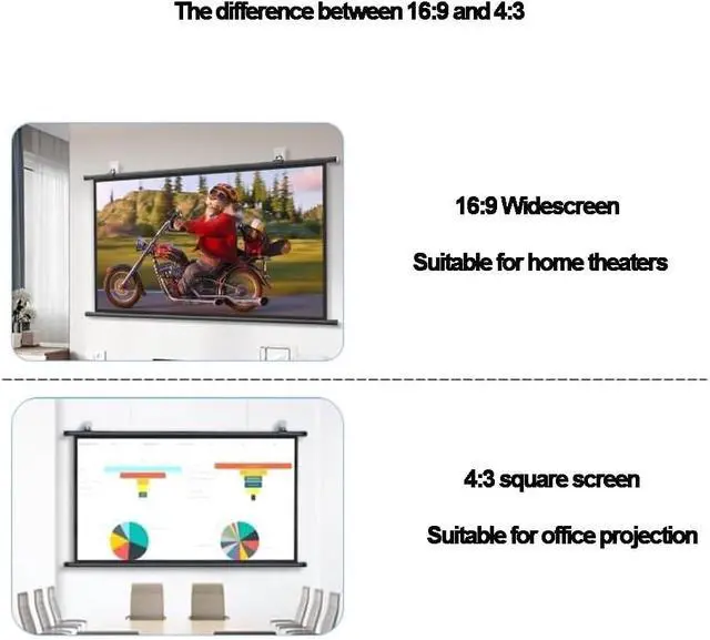 Available in 4:3 and 16:9 formats. The 16:9 screen is narrower, making it ideal for home theaters, watching movies, and TV shows. The 4:3 screen is more suitable for office teacher training, business presentations, and practical use.