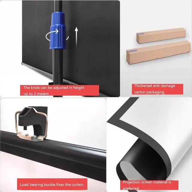 60-inch projector screen: The projector screen tripod with stand is made of sturdy metal with a thick main pole and 4 sturdy diagonal rods, as well as four aluminum tubes with spring tension at the ends to keep the entire projector screen structure stable, sturdy and flexible, and the height can be adjusted freely