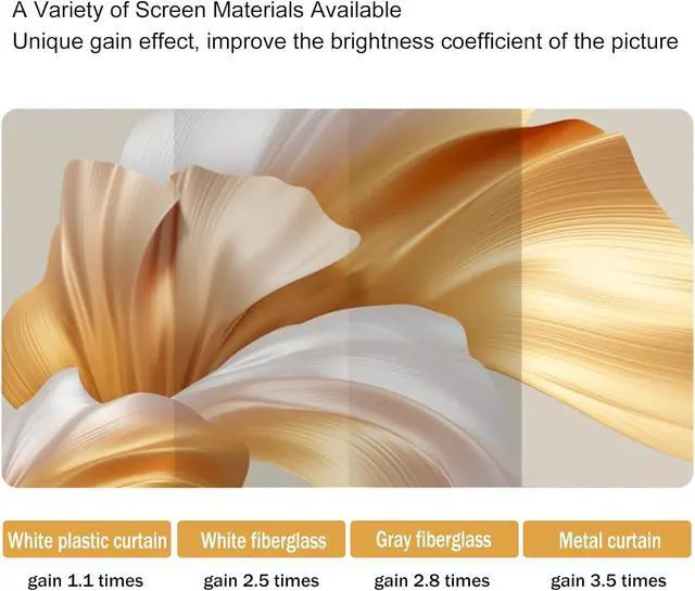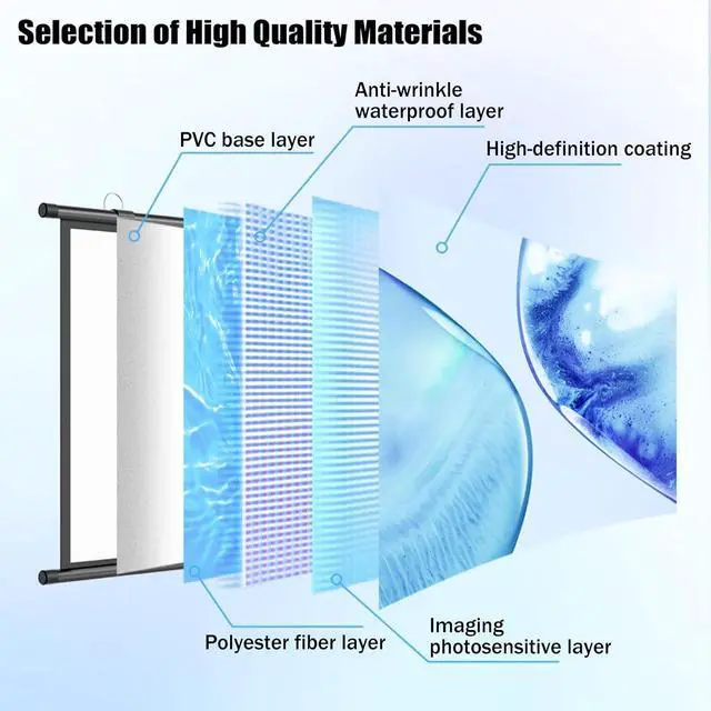 PREMIUM QUALITY: The projector screen is made of five layers of high-quality PVC and polyester fabric material, wrinkle-resistant, with a smooth surface for high-definition images, and a black back to eliminate light penetration and experience lifelike colours.