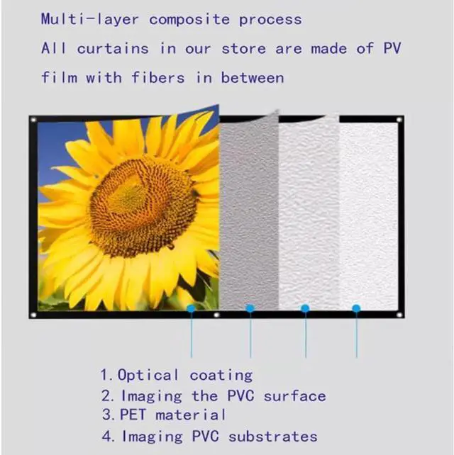 Wrinkle-free cinema screens: Projector screens use a soft-touch and stretchy thick polyester material to ensure wrinkle-free folding or compression, providing sharper images, brighter colors, and no color casts. Rest assured, all of our outdoor cinema screens go through a rigorous quality check process before being sent, so there won't be any spots on the screen that affect the viewing experience, and they're thick enough that you can't see what's behind them