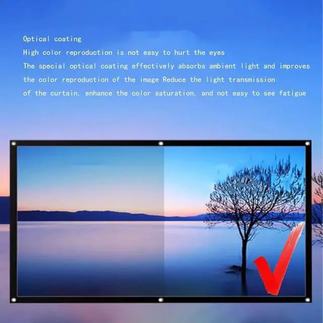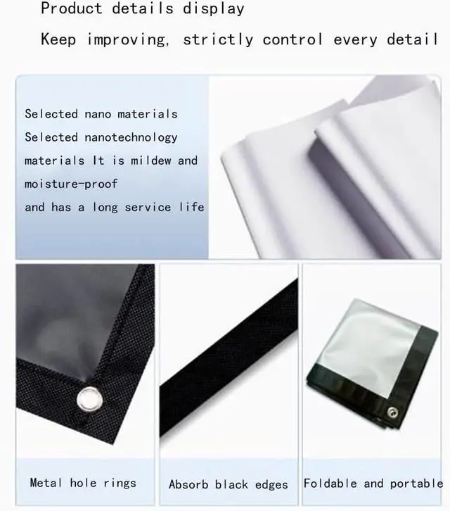 Portable and easy to install : This video projection screen can be folded into a small size, placed in your backpack or suitcase without causing any damage, and then taken anywhere you want with a storage bag. Best of all, this cinema screen for outdoor use is equipped with all the necessary tools (hooks, ropes, and stickers) and can be set up in just 5 minutes, and the whole process is not complicated and can be done on your own