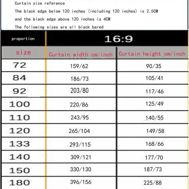 A variety of sizes are available: 40 inches 16:9, 60 inches 16:9, 72 inches 16:9, 84 inches 16:9, 92 inches 16:9, 100 inches 16:9, 110 inches 16:9, 120 inches 16:9, 133 inches 16:9, 150 inches 16:9, 180 inches 16:9, 200 inches 16:9 (see size chart for details)