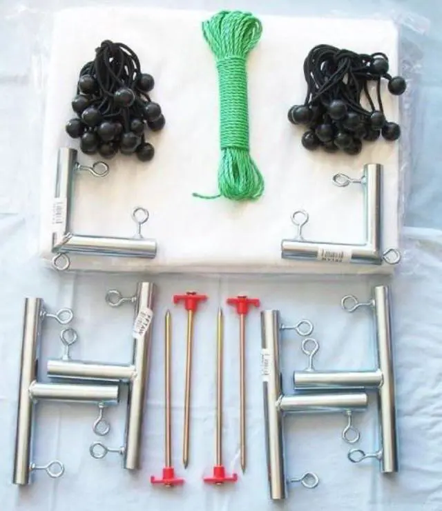 "Kit Includes: 10 x 10 White Heavy Duty Poly Tarp (Finished Size Approximately 96 x 96), 3/4"" Heavy Duty (Galvanized Steel) Fittings to connect your pipe to make the frame, Ball Bungees to attach the tarp to the pipe and rope and tent stakes to tie down your kit."