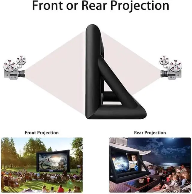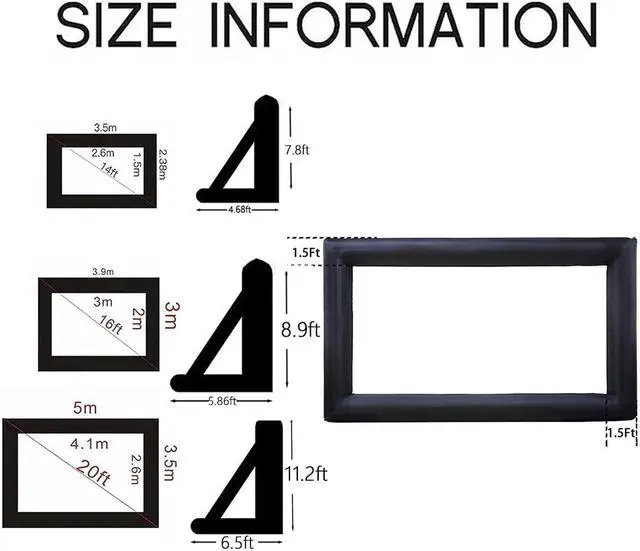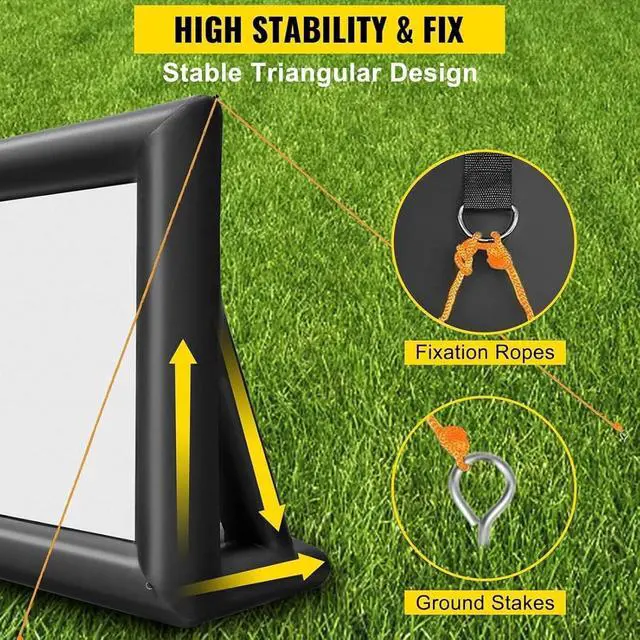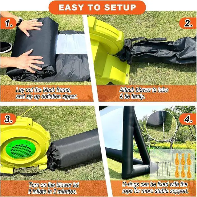 Includes: Inflatable movie screen, blower, long rope, nails, short rope, storage bag