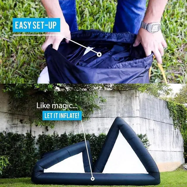 Includes: Inflatable movie screen, blower, long rope, nails, short rope, storage bag