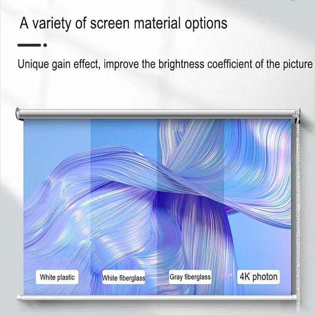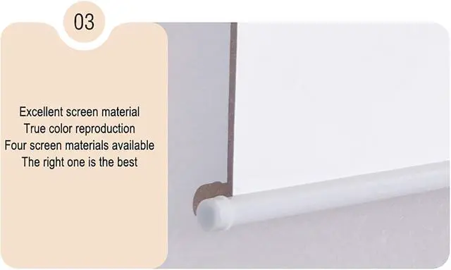 Portable projection screens can turn your living room into a movie theater in minutes, with stunning visuals that make you feel like you're in a virtual world, creating a whole new experience for you and your friends.Featuresdustproof, flat, not wrinkle-resistant, durable, easy to clean.Two installation methodscan be installed on the wall and ceiling.Black Frame DesignNot only can frame the picture, but also enhance the overall image contrast.Diffuse ReflectionProtect your eyes.How to usePull down manually.