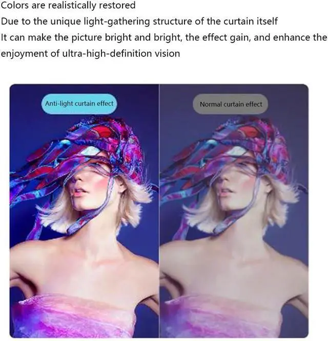 This anti-light curtain provides a 160° wide viewing angle, a 30° viewing angle, an exclusive C-position viewing angle, a frontal projection screen, high-definition effect presentation, a large screen field of view for clear viewing during the day, a 4K cinema-level anti-light curtain, direct projection during the day, and enjoy a high-quality viewing experience, without worrying about strong light, the effect gain is 2.5 times, and the color is truly restored