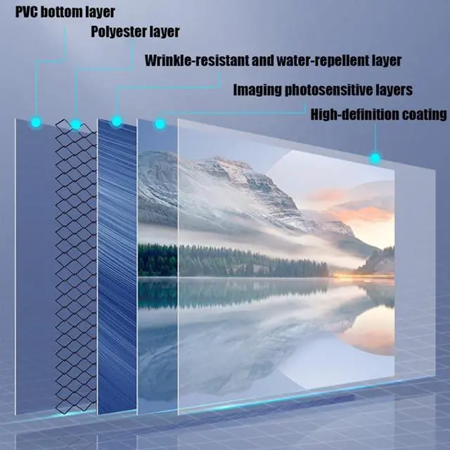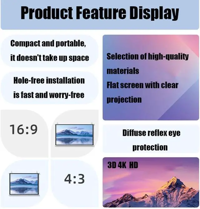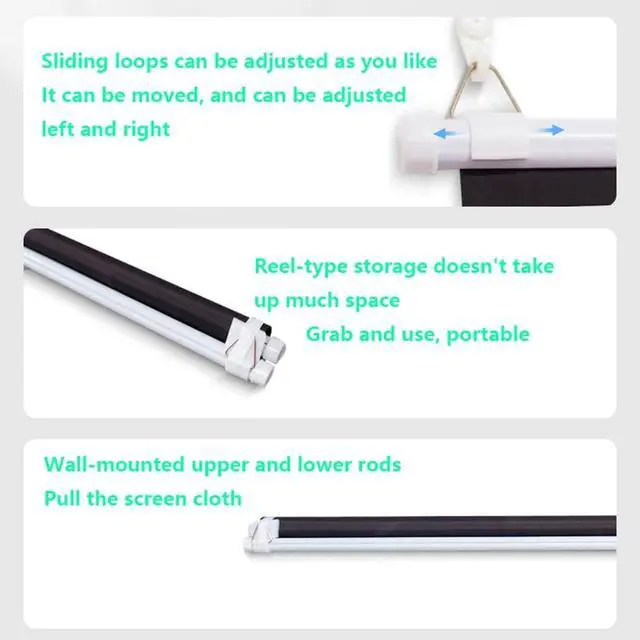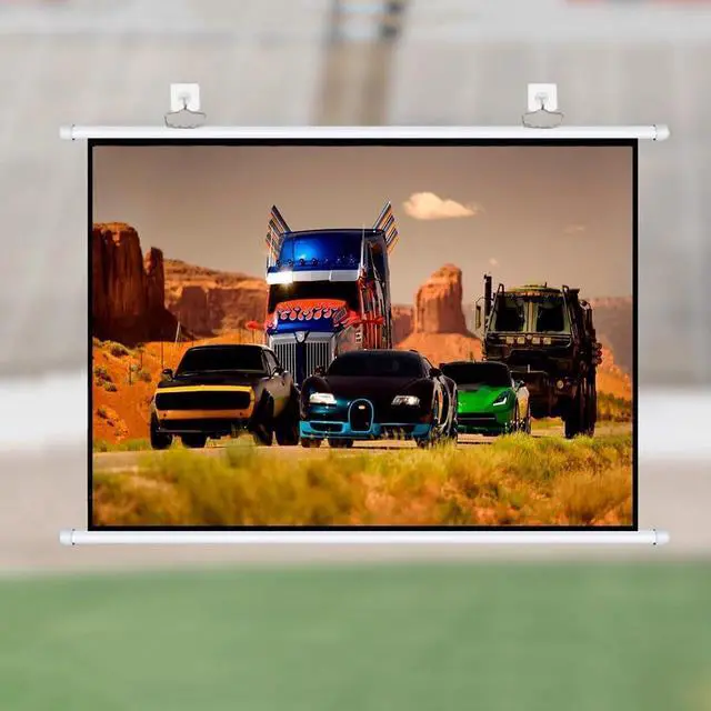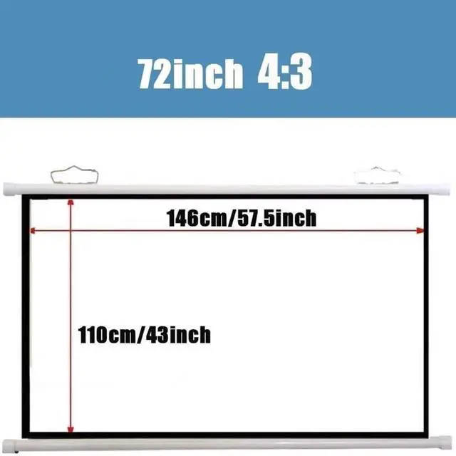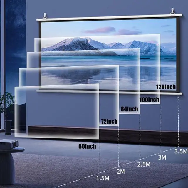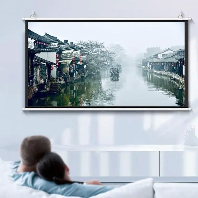 Pull down projector screen 168° viewing angles, bright colors. Simple installation, convenient storage. This projection screen can display movies, sports games, photos, music videos, games, which makes your life more interesting! Alternatively, you can display company graphics and data on a hand-scroll projection screen.