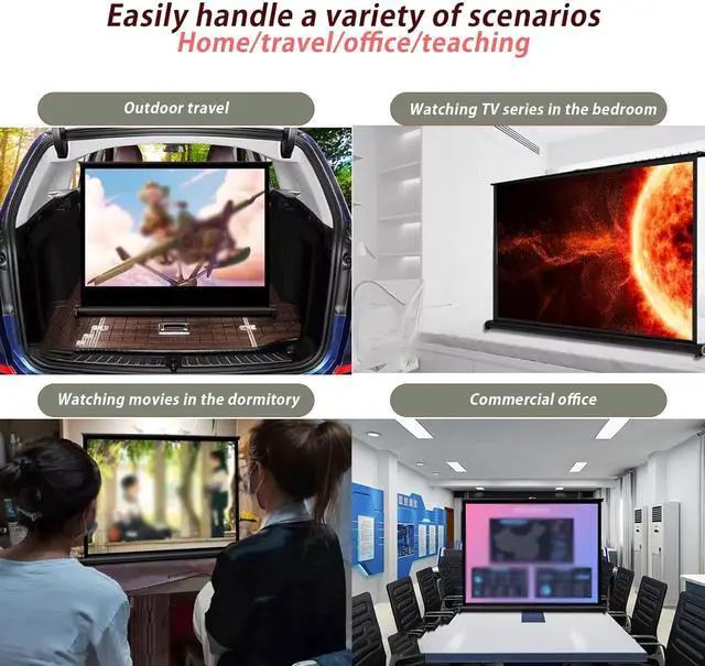 This roll up projection screen can be mounted anywhere, such as a flat floor or tabletop, and can be used indoors or outdoors with a variety of mounting methods. Great for mobile meetings, playing video games and watching movies, travelling, home theatre, office presentations, school meetings, backyard movies and more.