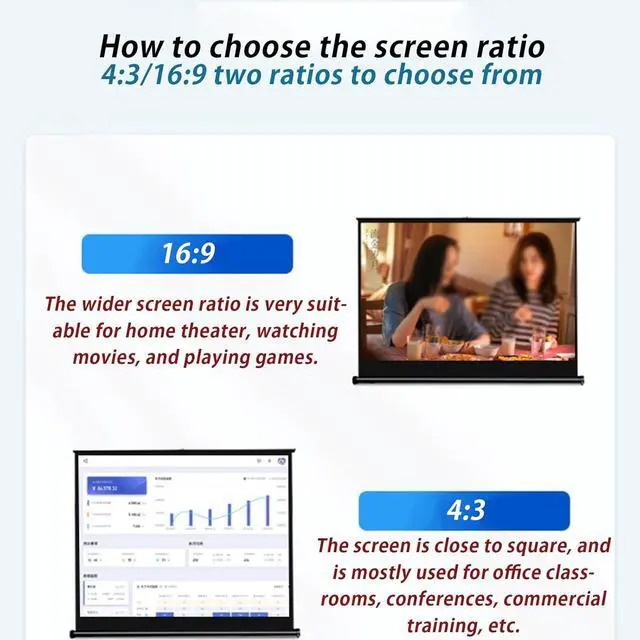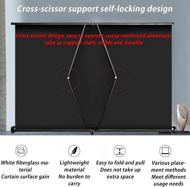 It can be unfolded and placed on any flat surface or tabletop indoors or outdoors, perfect for mobile meetings, video games and movies, travelling, home theatre, office presentations, school meetings, backyard viewing and more.