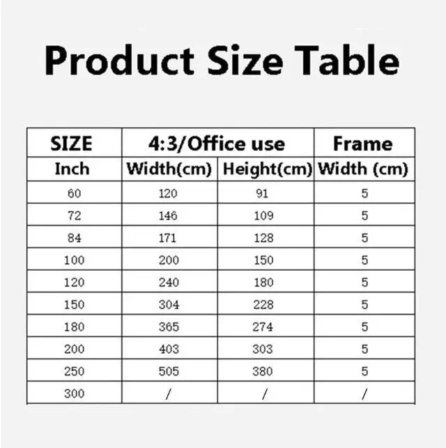 Product size: 60in/4:3, 72in/4:3, 84in/4:3, 100in/4:3, 120in/4:3, 150in/4:3, 180in/4:3, 200in/4:3, 250in/4:3