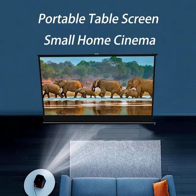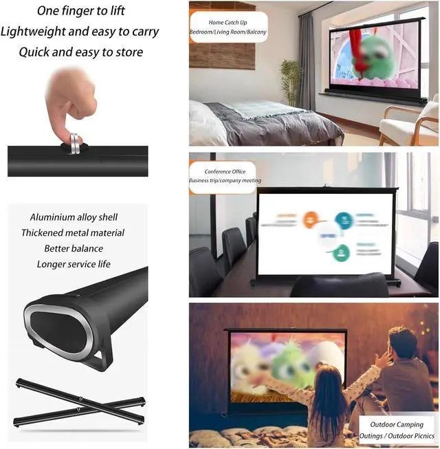 The HD projector screen can be placed on any flat surface or table indoors or outdoors. It is easy to use. Just rotate the support angle 90° and pull the screen apart to use.
