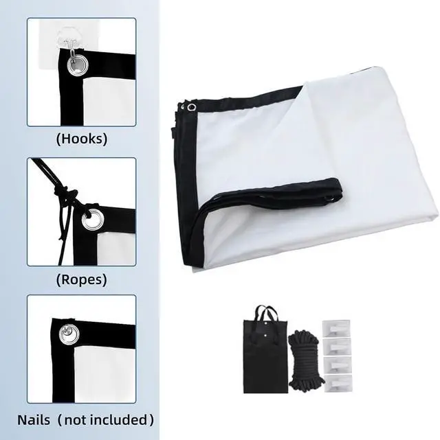 Easy to install: The outdoor projection screen comes with all necessary tools (hooks, ropes, and a carrying bag), allowing you to easily secure it to a wall or stand using hooks, ropes, brackets, nails