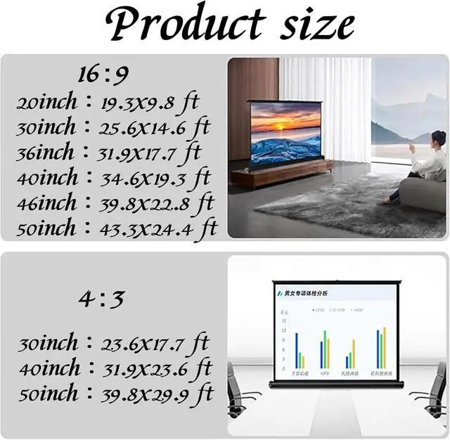 Wide viewing angleThe projection screen has a wide viewing angle of up to 178°, so you don't have to sit in front of the screen. There are 20"/30"/36"/40"/46"/50" (diagonal) and 16:9/4:3 screen ratios, so whether you want to watch your favorite movies, sporting events or high-impact presentations, this screen ensures that the image is clear and realistic.