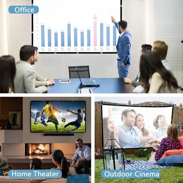 Portable projection screen is suitable for various indoor and outdoor scenarios, such as home theaters, education, presentations, lectures, offices, classrooms, or gaming; it is also suitable for outdoor use, such as backyard theaters or camping parties
