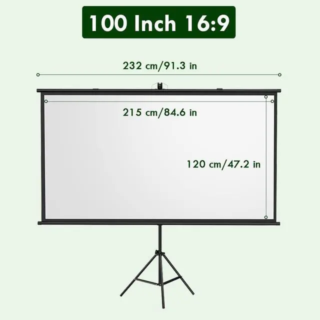 100-inch Projector Screen: The 16:9 format meets most application needs. The tension of the two upper and lower tubes ensures a flat screen surface, and the 2.5 gain factor delivers a clear, bright image